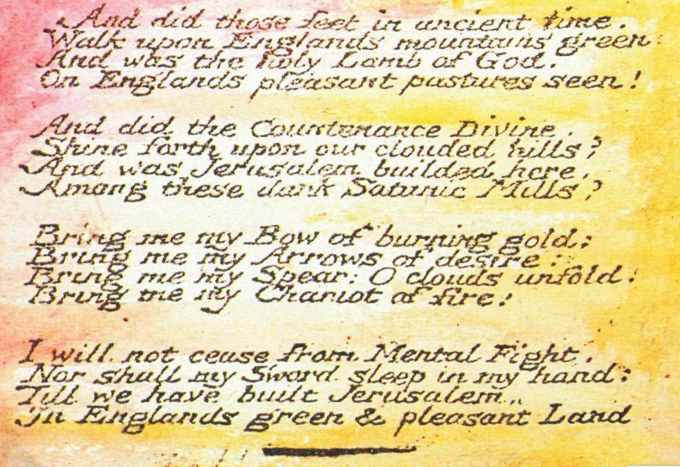 Here is what it looked like when Blake engraved and printed it in the preface of “Milton”: