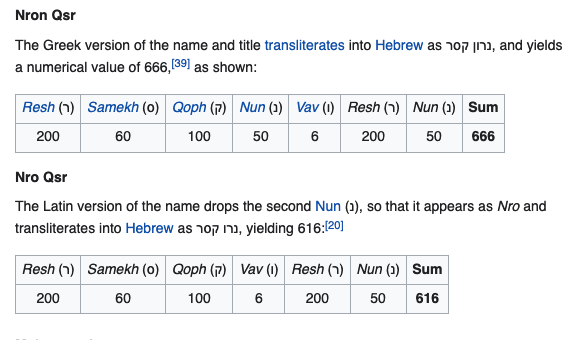 The number of the beast shows up in some very ancient manuscripts as 616, so any gemmatria would have to account for that. The name Neron Caesar is transliterated into Hebrew. Hebrew does not always bother with vowels, and Neron might also just end Nero. Thus we get the Hebrew equivalent of Nron Qsr or Nro Qsr.