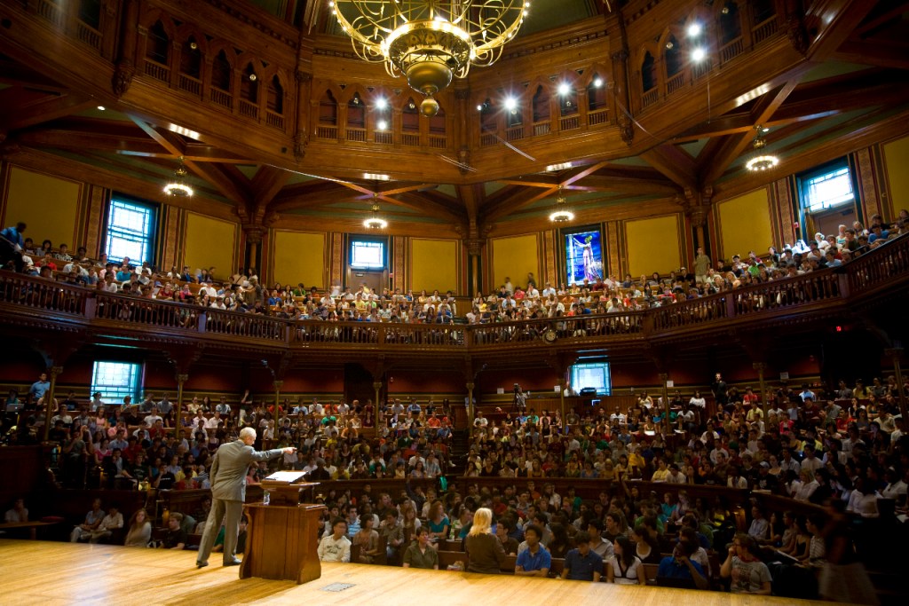 Professor Michael Sandel inside Sanders Theatre at Harvard University, teaching his course on Justice. (Cambridge, MA – September 15, 2008)